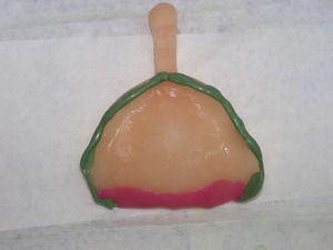 そのトレーを使用し、口腔内周囲の筋形成といわれる作業をコンパウンドを使用して筋圧で変形する軟組織にさまざまな運動を行わせ、運動時の形を採得し、その後流れのいいシリコンラバーの印象材を用いて行います。当院では保険診療の患者さんにも必ずこれを行います。それから、模型を起こしてこれを作業模型としております。